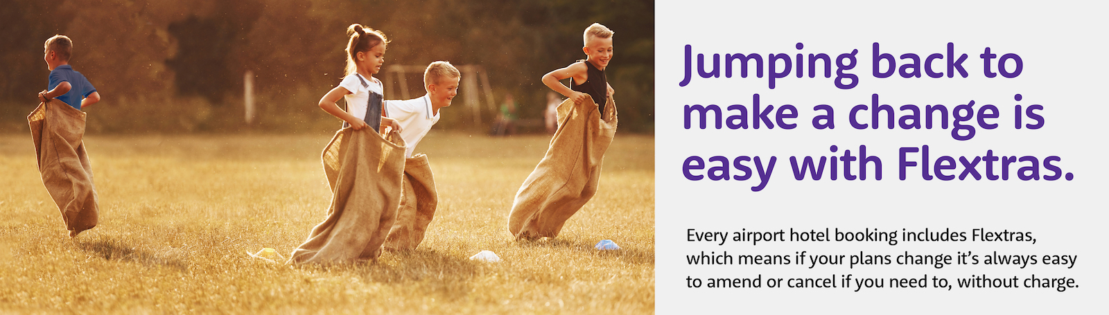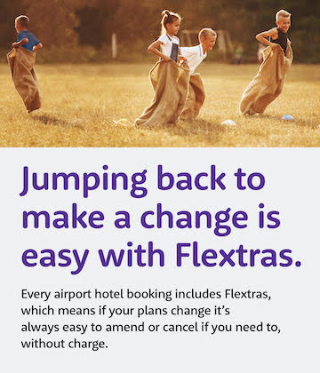 Jumping back to make a change is easy with Flextras. Every airport hotel booking includes Flextras, which means if your plans change it's always easy to amend or cancel if you need to, without charge - campaign June 2021