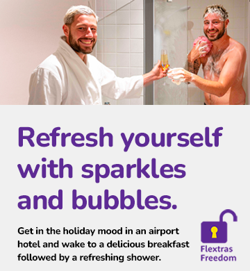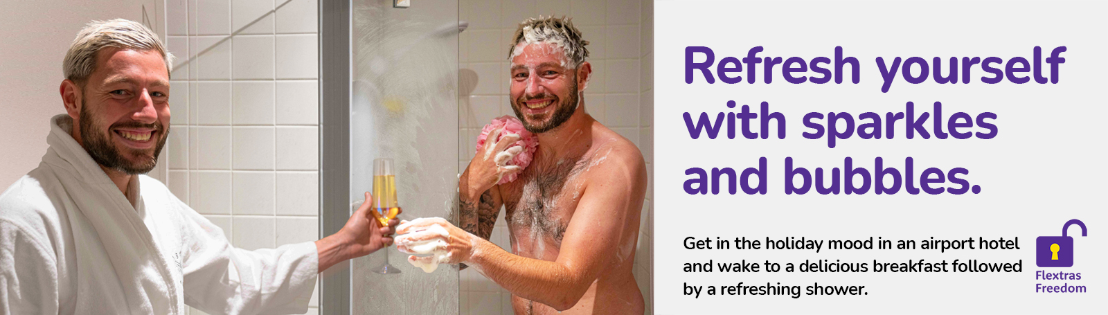 Refresh yourself with sparkles and bubbles. Get in the holiday mood with an airport hotel stay and wake up to a delicious breakfast followed by a refreshing shower - campaign March/April 2022