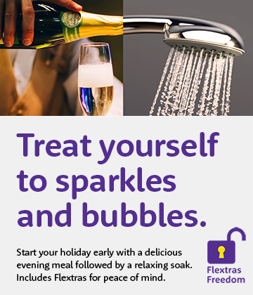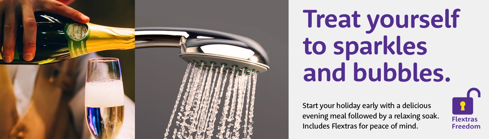 Treat yourself to sparkles and bubbles. Start your holiday early with a delicious evening meal followed by a relaxing soak. Booking's include Flextras for added peace of mind - campaign July 2021