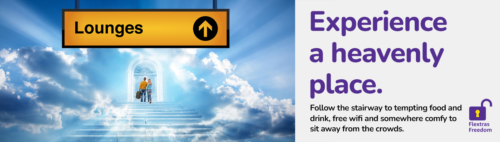 Experience a heavenly place. Follow the stairway to tempting food and drink, free Wi-Fi and somewhere comfortable to sit away from the crowds with an airport lounge - campaign July 2022