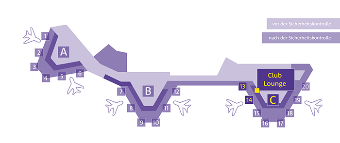 The lounge is located in the security area, Terminal C opposite the gates 13/14.