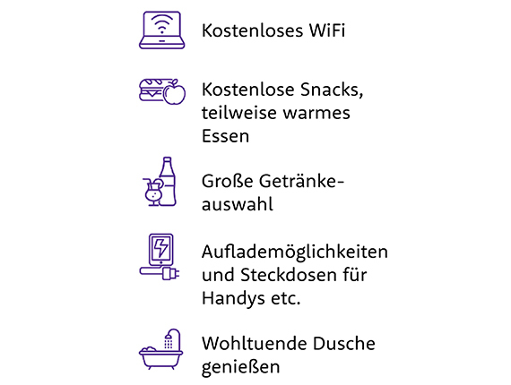 Ihr Ticket für 2-6 Stunden beinhaltet Getränke und Essen (kostenlose Snacks oder warmes Essen), WLAN, Ladestation füer Handy und Co, erfrischende Duschmöglichkeit, TV und Lesestoff (Magazine und Zeitungen) etc.