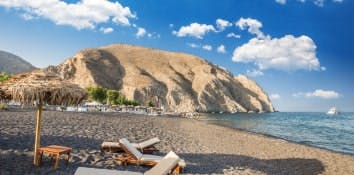 Kamari, aka 'Black Beach', is one of the most easily accessible and visited beaches in Santorini. With hundreds of sunbeds along the beautiful black sand, lifeguards, diving centre, beach volleyball area, plus various shops, restaurants and bars, Kamari has everything you need for the perfect beach day.