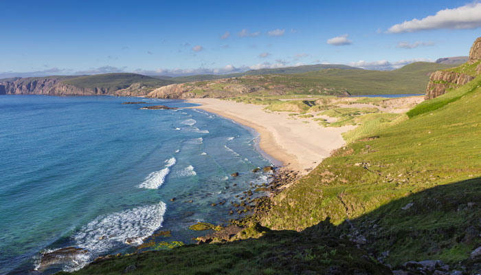 A big healthy slice of Scotland's wild and wonderful beauty. Sandwood Bay on the north-west coast is a mesmerising mile of golden sands, pristine North Atlantic Ocean, rolling dunes, dramatic cliffs and the sweet scent of sandalwood.